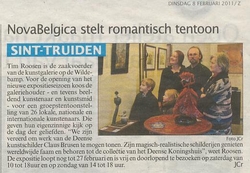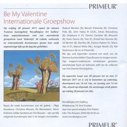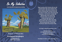 Be My Valentine Internationale Groepshow Op vrijdag 28 januari 2011 opent de nieuwe Truiense kunstgalerij NovaBelgica Art Gallery haar expositieseizoen met een wervelende groepshow rond Valentijn. 26 Lokale, nationale en internationale kunstenaars geven hun vaak eigenzinnige kijk op de dag der geliefden. Naast de vaste kunstenaars van de galerij Olga Gouskova, Christine Morren, Els Wenselaers, Steve Kirkham, Eddie Symkens en Tim Roosen zijn we blij volgende kunstenaars aan U te mogen voorstellen: Roland Menten (B), Benoit Polveche (B), Christine Polis (B), John Haley III (USA), Johan Nieuwborg (B), Delphyne V. (F), Dimitri Cambier (B), Miraschi (B), Peter Geerts (B), Trëz (F), Kristel Van Rumste (B), Jef Bertels (B), Marifey (B), Patrice Hubert (F), Manu Van H (F), Marcel Witte (NL), Ansgar Noeth (D), Raf Veulemans (B) en Jo Pirard (B). We zijn ook bijzonder vereerd om werk van de Deense kunstschilder Claus Brusen te mogen tonen. Zijn magisch-realistische schilderijen genieten wereldwijde faam en behoren zelfs tot de collectie van het Deense Koningshuis. De expositie loopt van 29 januari tot en met 27 februari 2011 en is vrij te bezoeken op zaterdag, doorlopend van 10 tot 18u, en zondag van 14 tot 18u, alsook op afspraak. De vernissage vindt plaats op vrijdag 28 januari vanaf 20u. NovaBelgica Art Gallery, Wildebamp 19, Sint-Truiden (aan het sportcomplex Sint-Pieter) Info: Tim Roosen: 0495/689485 en www.novabelgica.com